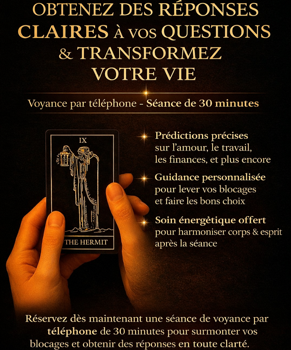 Je vous propose une séance de voyance par téléphone de 30 minutes maximum, conçue pour vous apporter des éclaircissements précieux sur votre avenir et vous guider sur votre chemin de vie.
