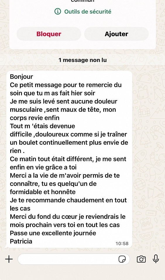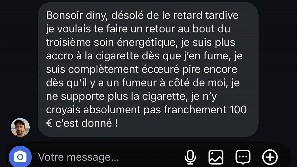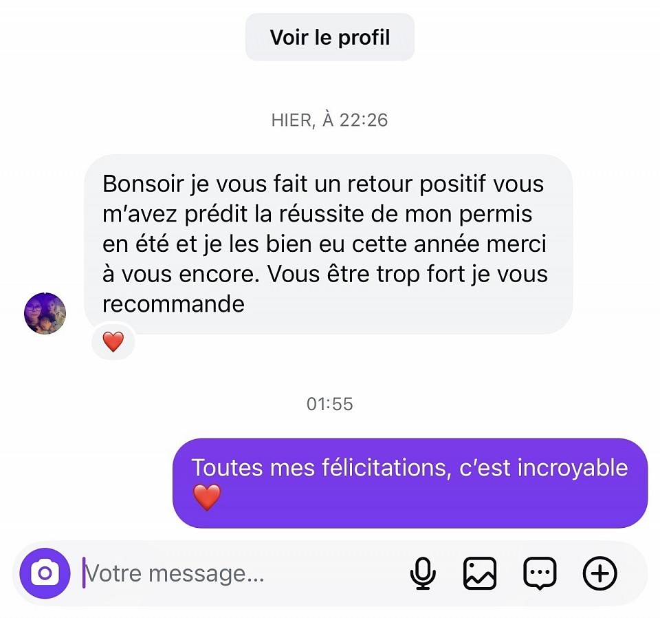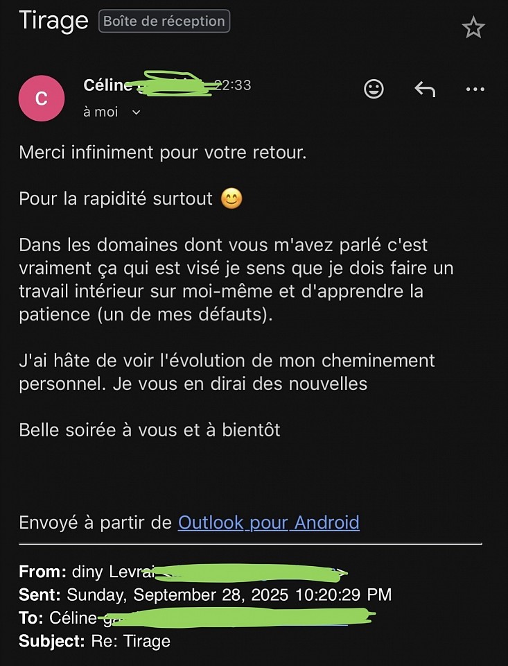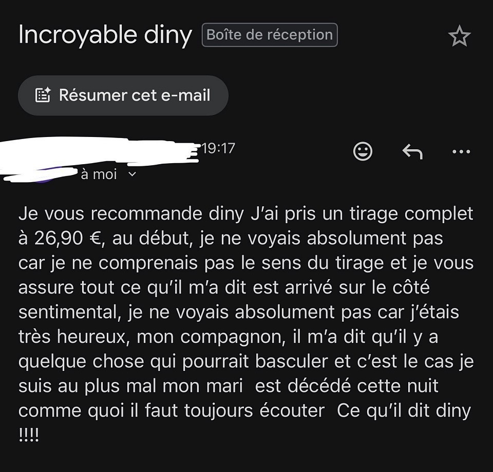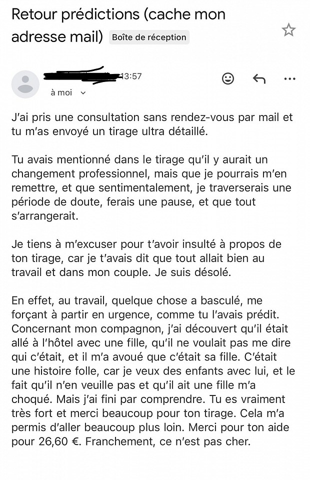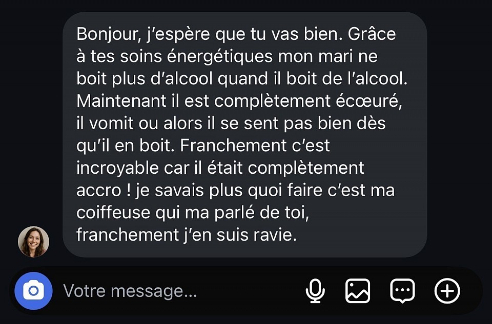 Découvrez ici les avis clients de Diny, voyant et magnétiseur. Toutes les prestations - voyance par e-mail, soins énergétiques, magnétisme - génèrent de nombreux retours réels et authentiques. Ces témoignages vérifiés reflètent l’efficacité des séances ainsi que la confiance que mes clients me portent depuis plus de 20 ans.